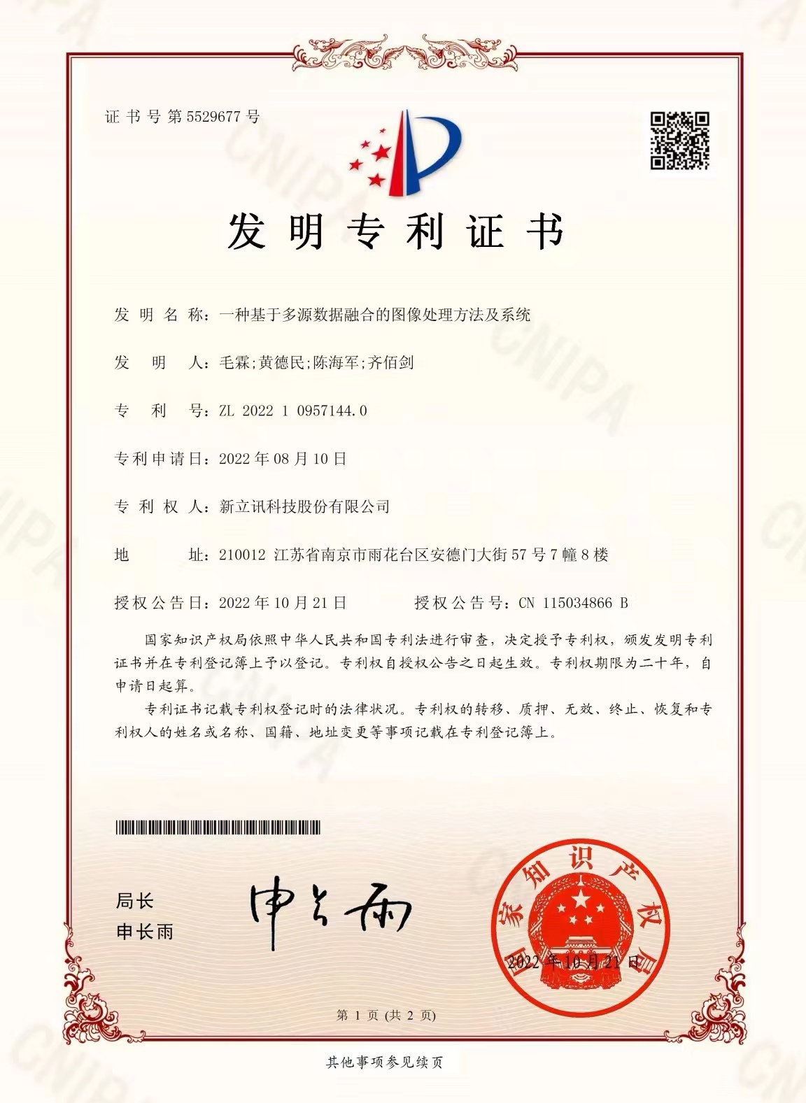 近日,我司新獲國家知識產權局兩項發明專利,發明專利號:ZL2022109571440,一種基于多源數據融合的圖像處理方法及系統;發明專利號:ZL2022109571455,一種數據鑒真處理方法、裝裝置、計算機設備及存儲介質。